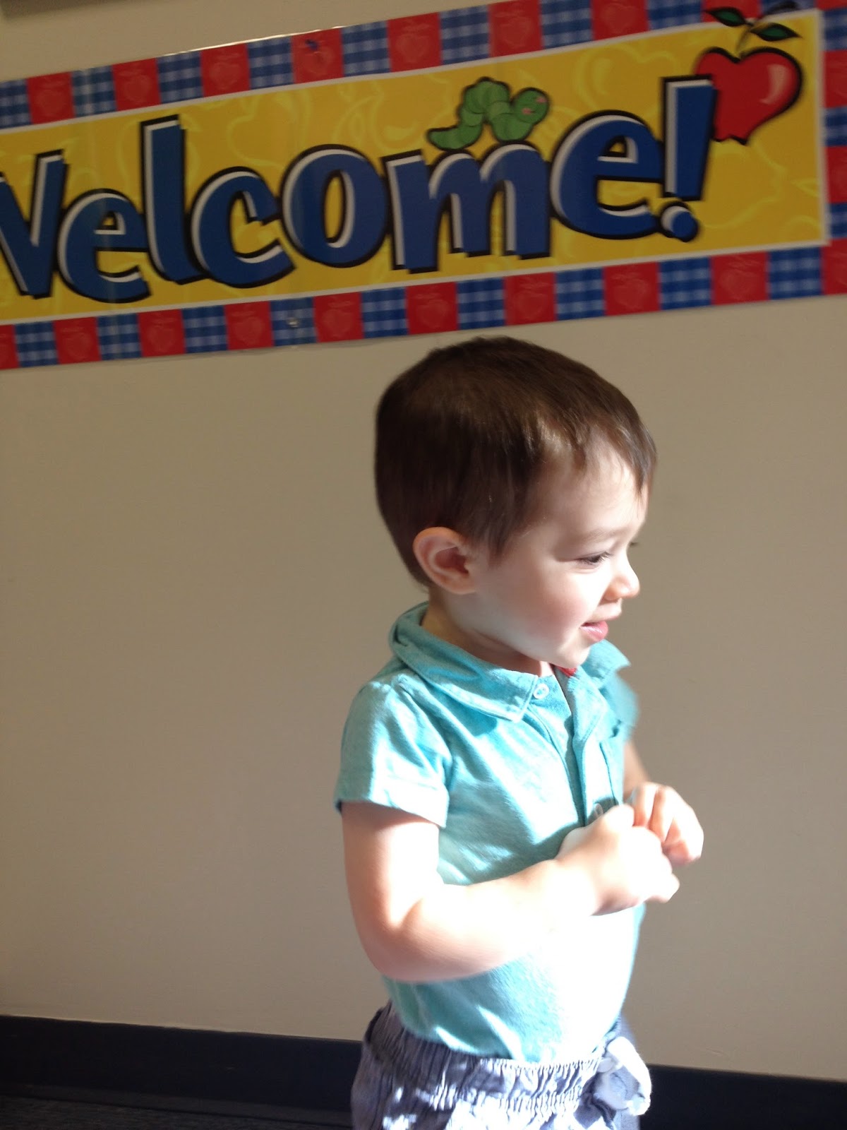 Liam is doing so well in all his therapy areas- he's at age level in many areas in physical therapy and is catching up in occupational therapy. In speech, he's making really impressive gains. With all of the appointments we have, I haven't found a way to get Liam around other kids his age on a regular basis. We take him to the YMCA's "stay 'n' play" but most of the kids there are much older and we take him to the church nursery on Sunday mornings but he and Malia have always been the only two kids there. I really thought that giving him time with other kids age could help his development in all the different areas so when we came to Maryland for the first time, trying to find a place to live, we looked at some preschools but the vast majority of them required the child be two by September 1st. Liam's birthday is September 5th. So I kind of put that on the back burner while we were planning for and then welcoming Malia into our family. However, on Monday, I was trying to get Liam and Malia inside and Liam refused to hold my hand. Thankfully we live in an apartment where you park in the circle out front and the circle is very close to the front door and the only traffic consists of residents either pulling into parking spots or leaving parking spots- not high speeds- but I still would like him to learn to hold my hand when I need to have a handle on him. I got inside- put him down for his nap- and immediately started looking for preschools. I thought it would be good for him to participate in lining up, circle time, routine things that require a tad bit of obedience and that if he saw other kids listening to directions maybe he would too. I also thought it would be really helpful for him to hear other kids using age appropriate language- words that he probably understands but isn't quite able to articulate yet. So I called Anchors-A-Wee on Monday and they had actually started that day but it was an odd day where all the parents were invited to stay so everyone's real first day would be Wednesday- he would fit right in and not miss a beat. And since separation anxiety is not something we have had to deal with I wasn't worried about him needing that first day with me within his sights.